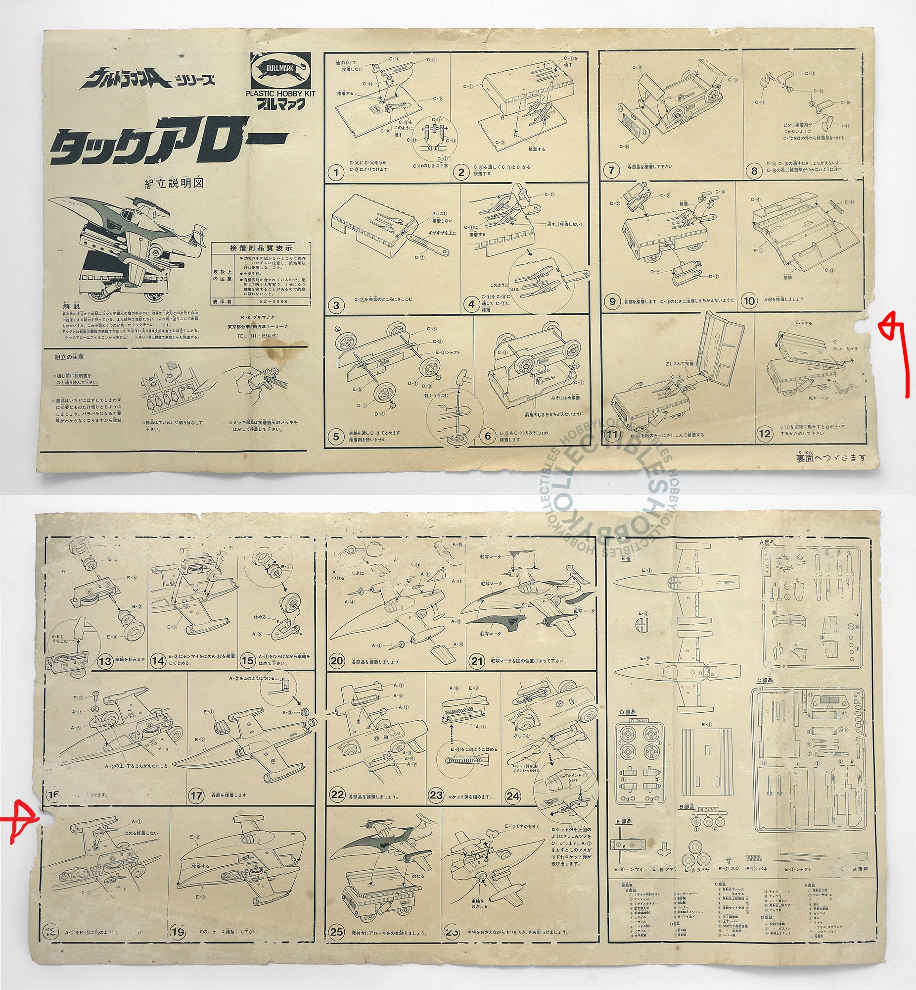 BULLMARK | ULTRAMAN ウルトラマンレオ | ULTRAMAN ACE TAC ARROW FIGHTER Bullmark is the very first company to release Ultraman series toy & model kits in 1966-1974. Up for sale is a mega rare and important vintage Bullmark Ultraman ACE series wind-up fighter plastic model kit, kit comes with metal wind-up mechanism which is very popular in the 70's, truly a unique/beautiful and important plastic model kit from the everlasting Ultraman series. - - - - - - - - - - - - - - - - - - - - - - - - - - - - - - - - - - - - - - - - - - - - - - - - - - - - - - - - - - - - - - - - - - - - - - - - - - - - - - - - - - - - - - - - - - - - - - - - - - DESCRIPTION: Manufacturer : Bullmark Name : Ultraman ACE TAC Arrow Fighter Model number : NIL Scale : Unknown Material : Plastic Box size : Approximately 40.6 x 26 x 6.5 cm ( 16" x 10.25" x 2.56" ) Release : Circa 1974 • 100% authentic, all original, absolutely NOT fake / recast / copy. • Made in JAPAN. • Discontinued mega rare item. • Condition : Open box, unassembled, poor box/instruction sheet & decals. • Box is in VERY POOR conditions, dirty with stains and marks, scratches, damaged panels, box wear/dent and fade panels, please refer to the photos. • Content : All parts are still in sealed bags - unopened and untouched, complete, minor scratches on plastic bag and all parts are still intact with the sprue, please refer to the photos. • Decal seems in poor condition- stains and yellowing, not sure if it is working fine so buyers please put this into your consideration, please refer to the photos. • Kit comes with a metal wind-up mechanism. • Body measures about 20 cm (7.88") long. • Very dirty instruction sheet - faded, satins and damaged. • This is a important and beautiful vintage model kit, a must have item for both model builder and collector! • ALL PHOTOS ARE OF ACTUAL ITEM FOR SALE - all photos are newly taken to ensure that item should arrive exactly as shown in the pictures. What you see is exactly what you get! • Item will packed with bubble wrap / foam for safety protection. Should you have any questions about my items, please feel free to contact me. |