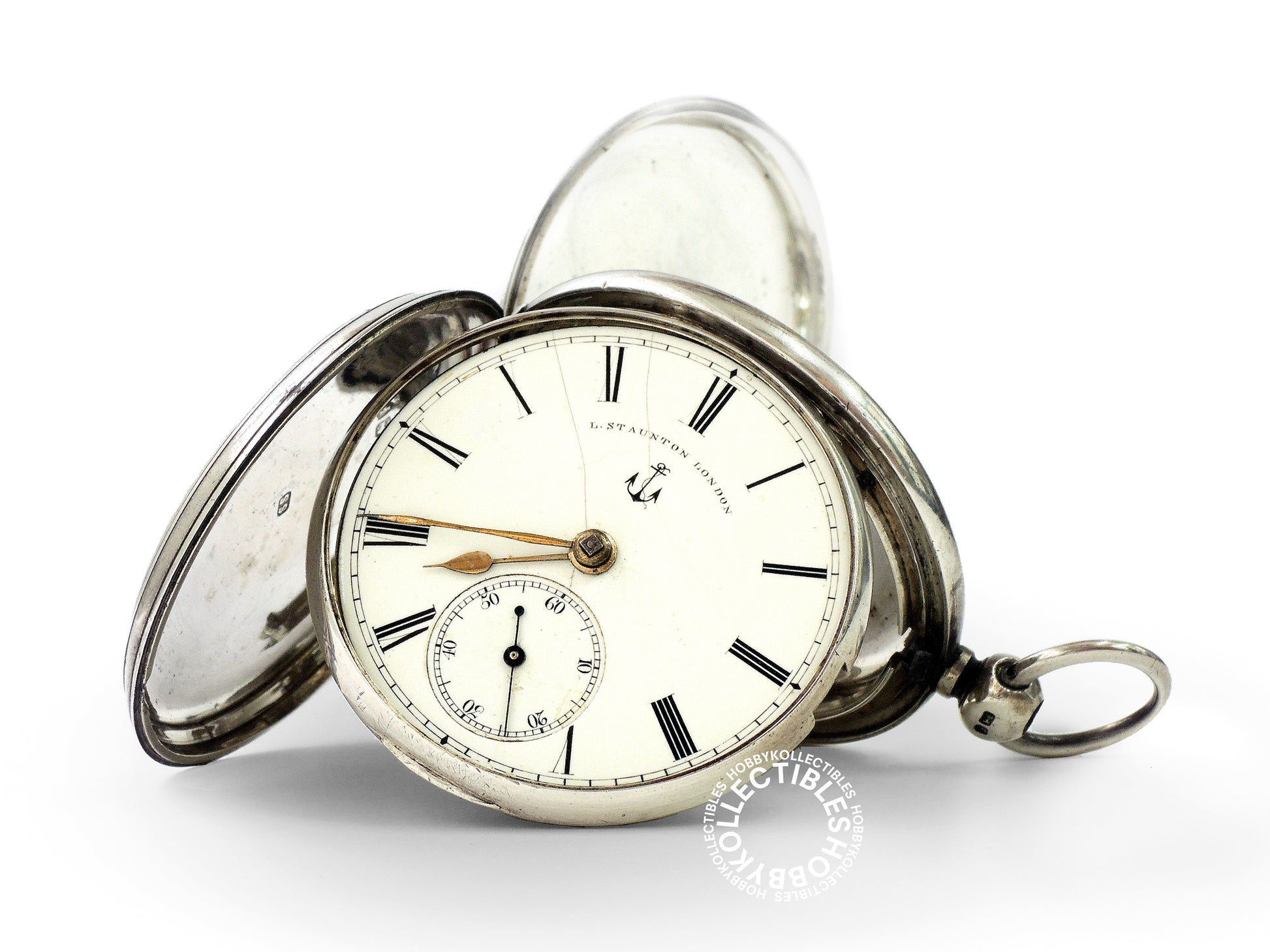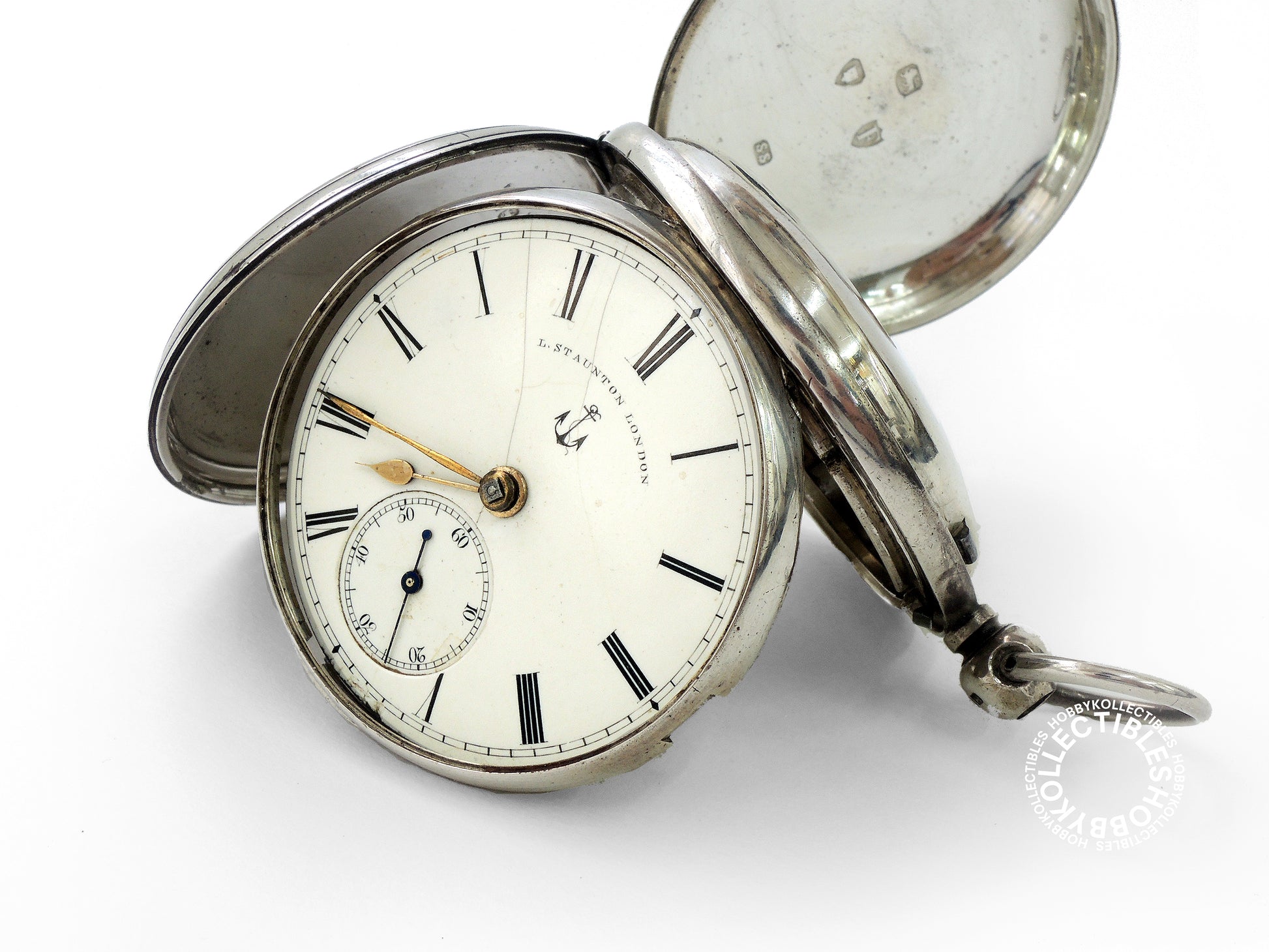 Up for sale is beautiful silver hunter case PW, dial signed "L.Staunton London" with a anchor logo, lever escapement movement, watch is in running condition but accuracy not timed, may needs minor repair/cleaning, cracked dial and MISSING the release button and glass crystal, a SOLD-AS-IS item! Please refer to all the photos.