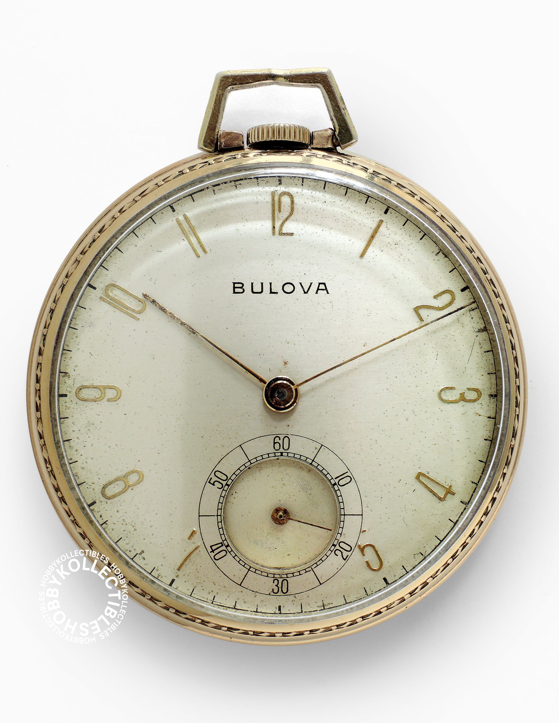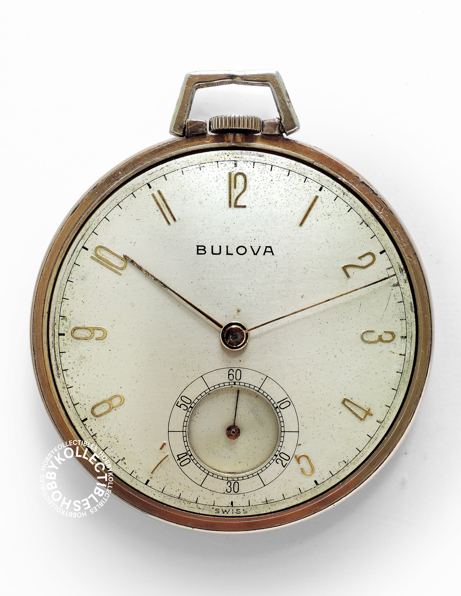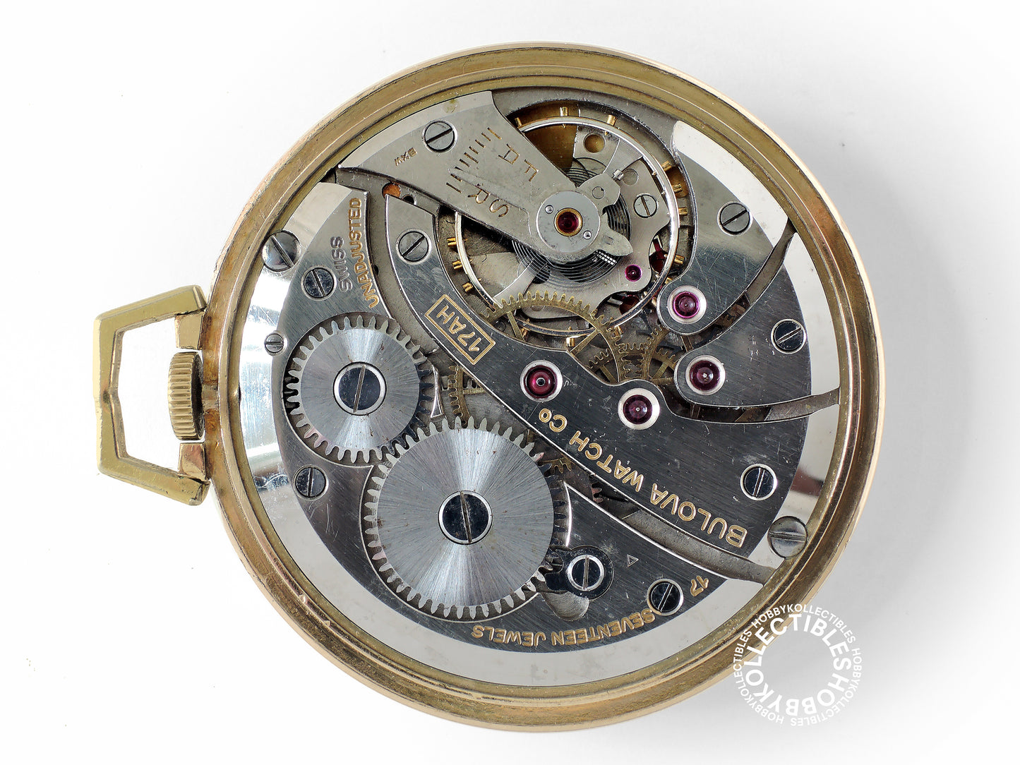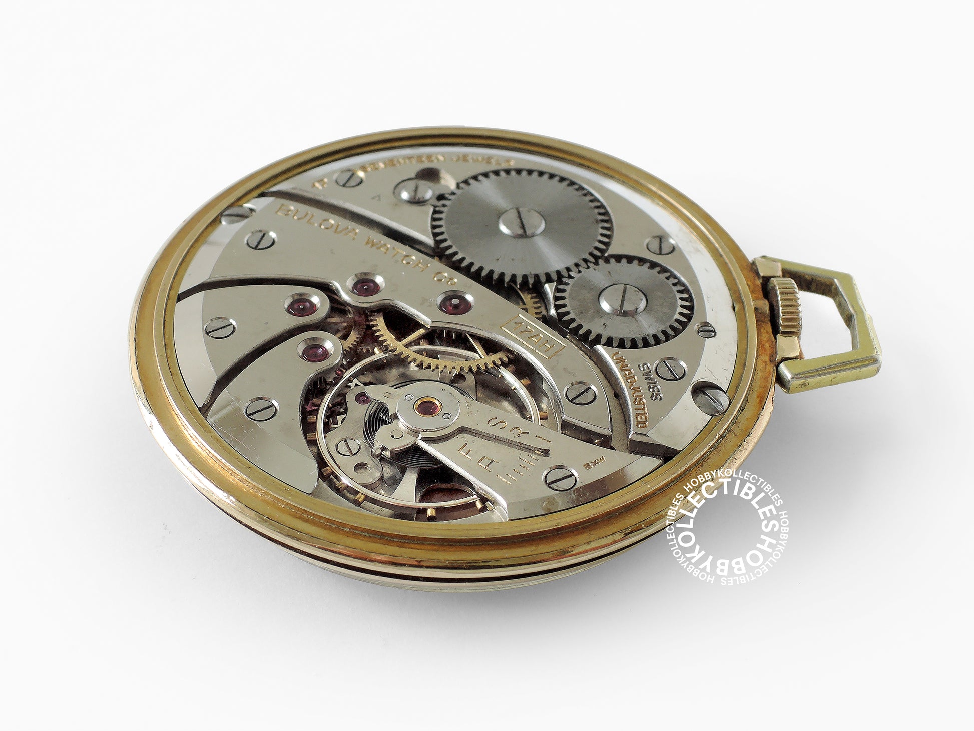 Movement : Swiss 17AH, stem wind stem set, lever escapement with 17 jewels, running condition but accuracy not timed, compensation balance with steel hairspring, balance staff is OK, signed "BULOVA WATCH C° 17 SEVENTEEN JEWELS SWISS UNADJUSTED", dirty with scratches and cleaning marks.