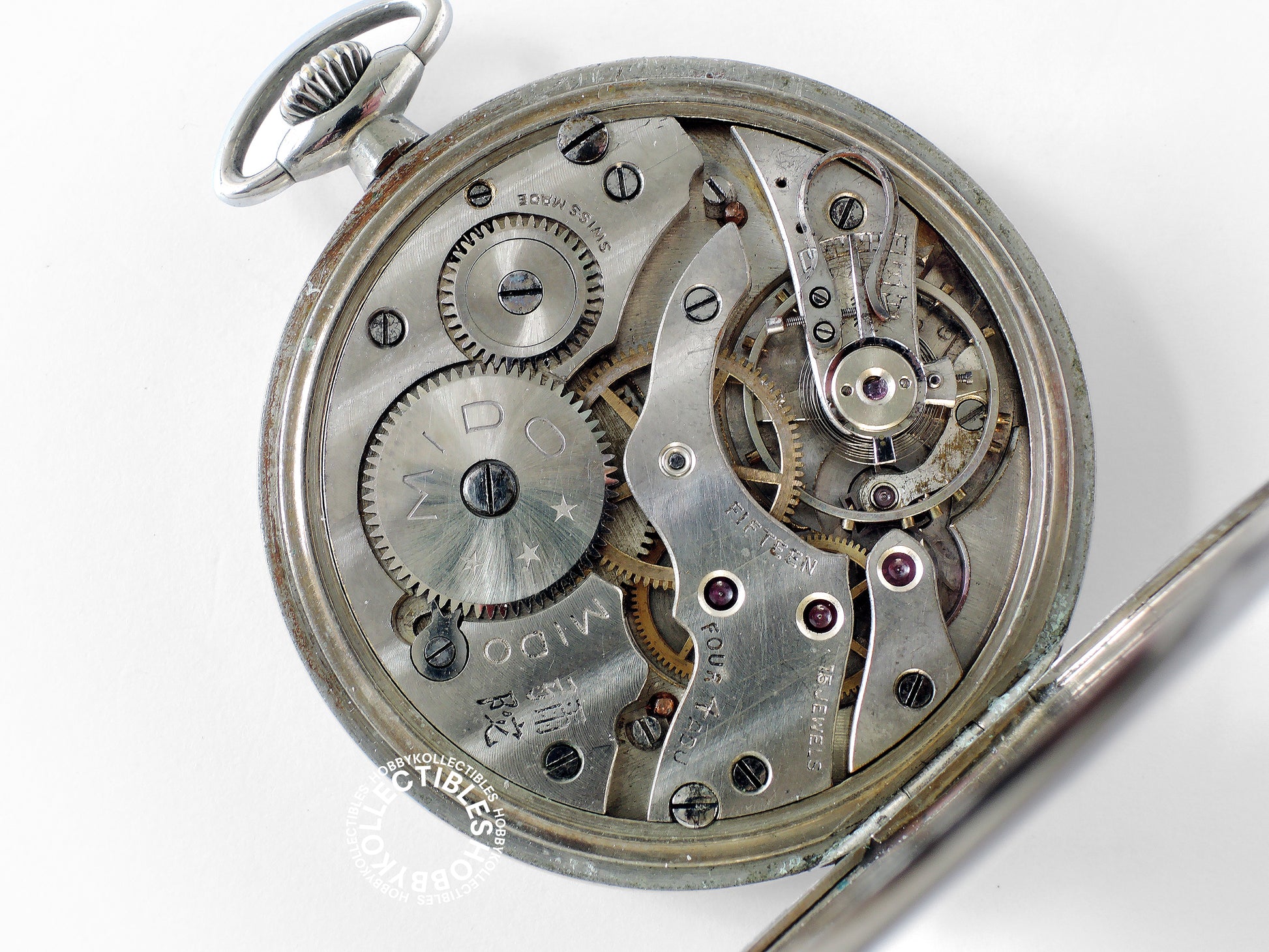 Movement : Damaskeen nickel lever escapement with 15 jewels, stem wind stem set, running condition but accuracy not timed, compensation balance with steel hairspring, balance staff is OK, signed "MIDO 彌陀 SWISS MADE FIFTEEN 15 JEWELS FOUR ADJ", the swank neck regulator is NOT original, dirty with scratches and cleaning marks.