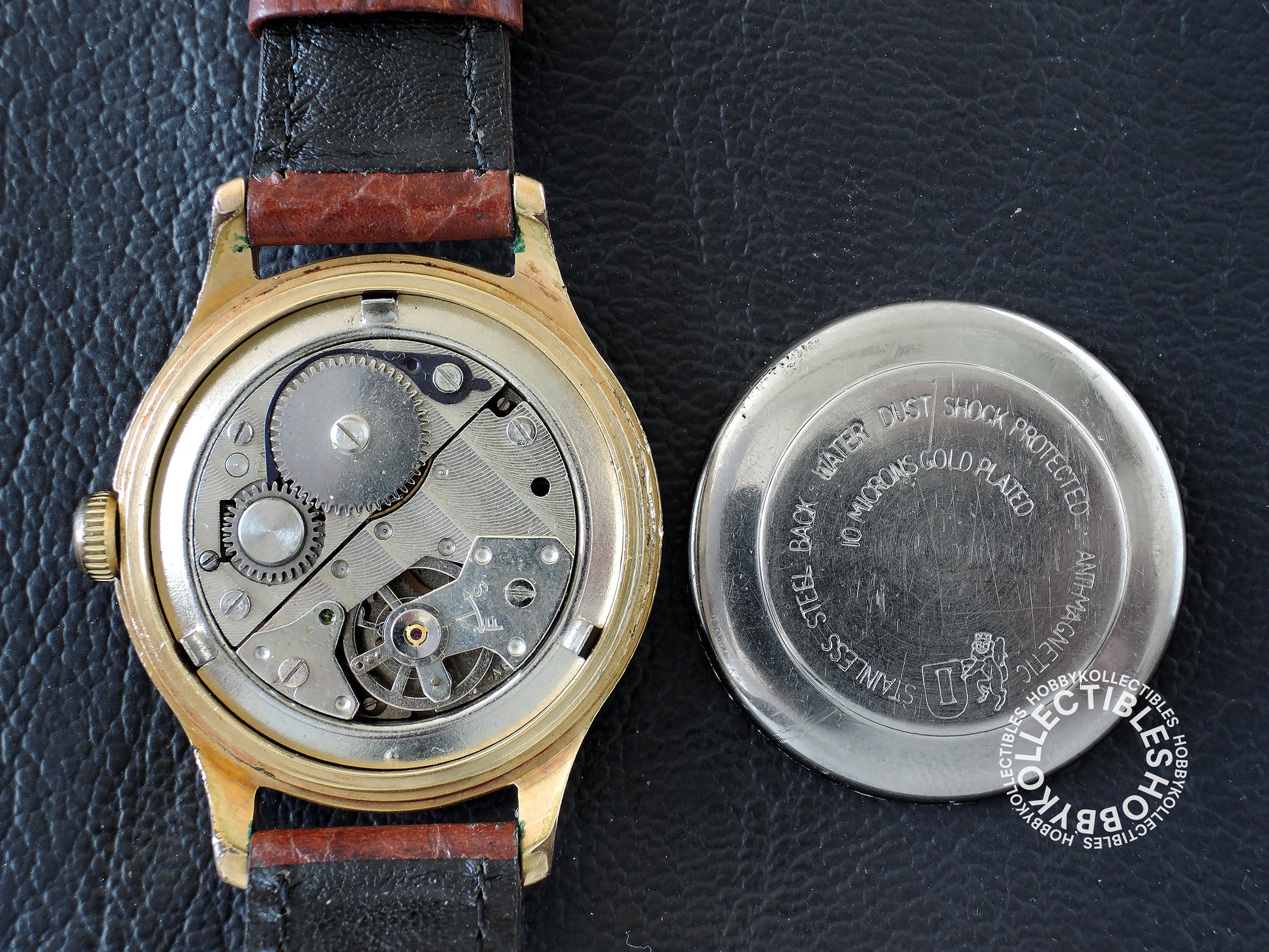 Case : Gold plated round case with stainless steel snap on back, case back marked "STAINLESS STEEL BACK • WATER DUST SHOCK PROTECTED • ANTI-MAGNETIC 10 MICRONS GOLD PLATED". Dirty with stains, few oxidation and scratches.