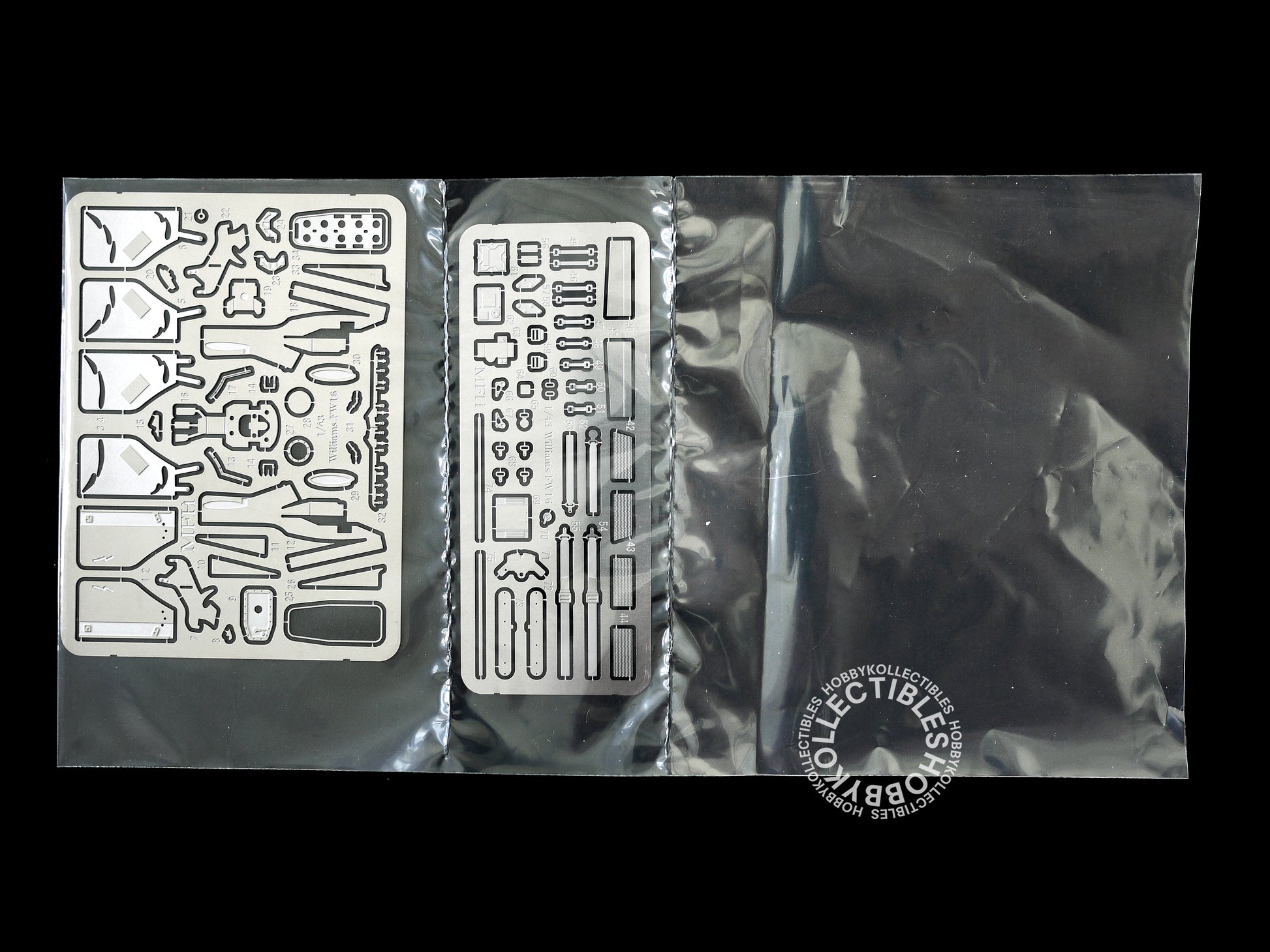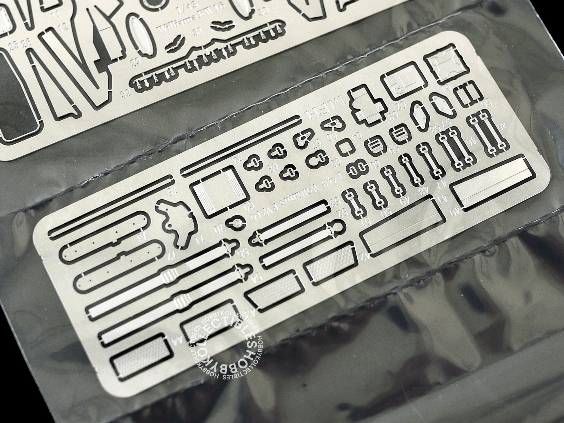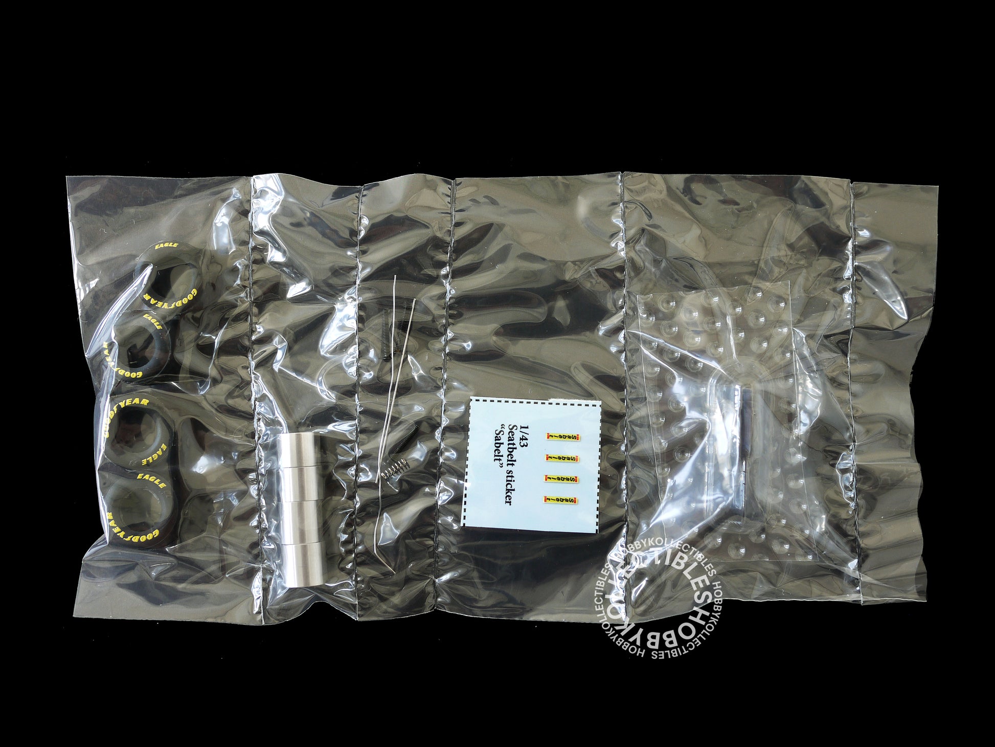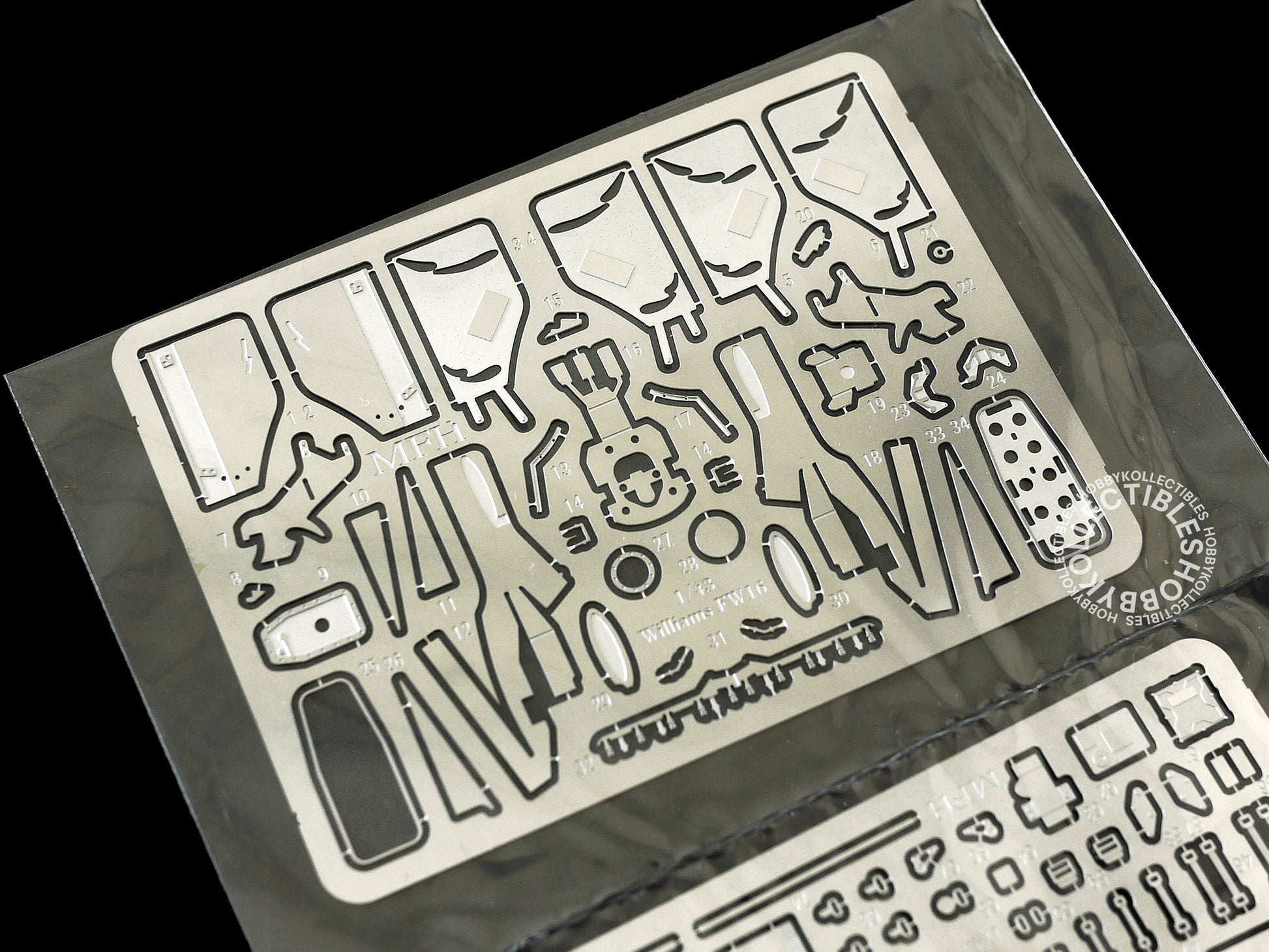 • A multi-media kit which contains mainly white metal, turned metal, screw, photo etched parts, waterslide decals and rubber tires.