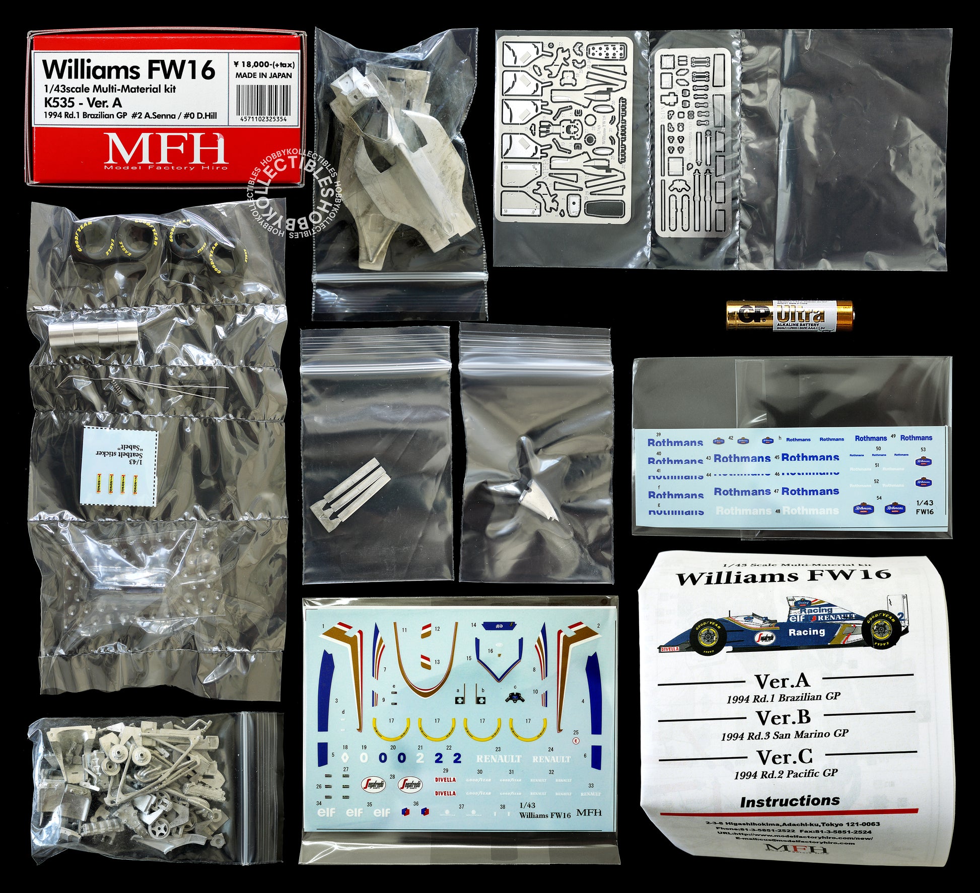 Up for sale is a rare & beautiful "Williams FW16 ver.A" model kit, comes with metal body and chassis together with photo-etch parts, rubber tires and lots of metal parts too! truly a awesome multi-media kit made by early MFH.