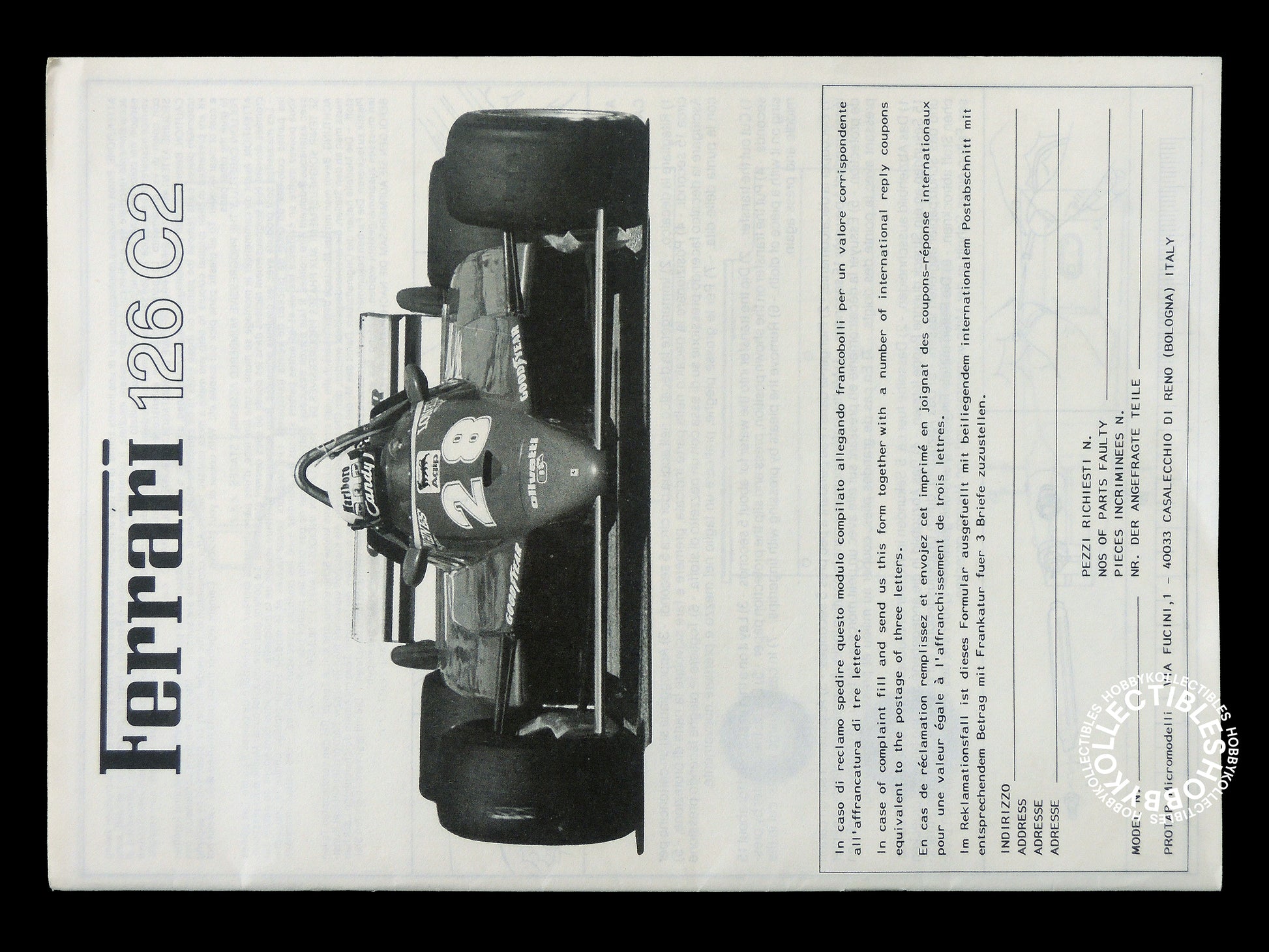 Up for sale is a extremely beautiful 1/12 Ferrari 126C model kit - comes with detailed engine parts, monocoque, silver plated parts, screws, wires, metal mesh and soft rubber tires, truly a exceptional beautiful kit manufactured by early Protar with passion.