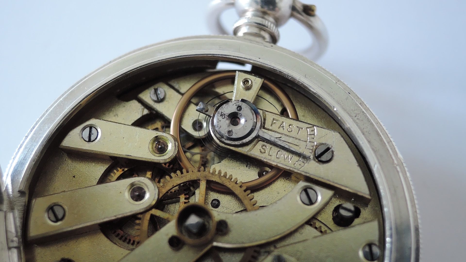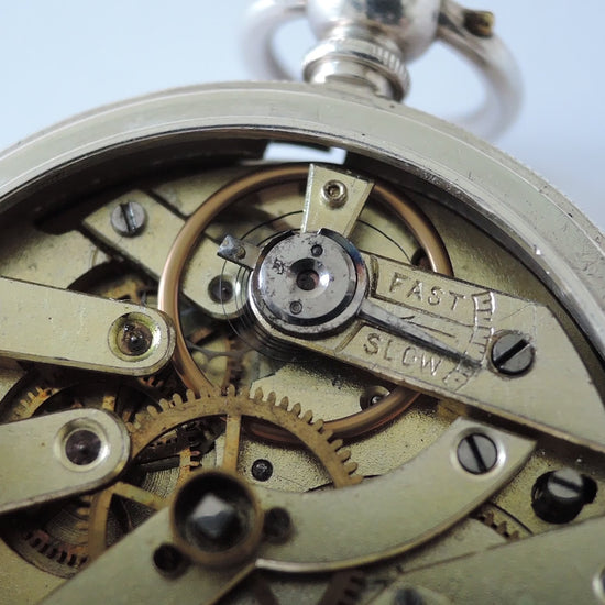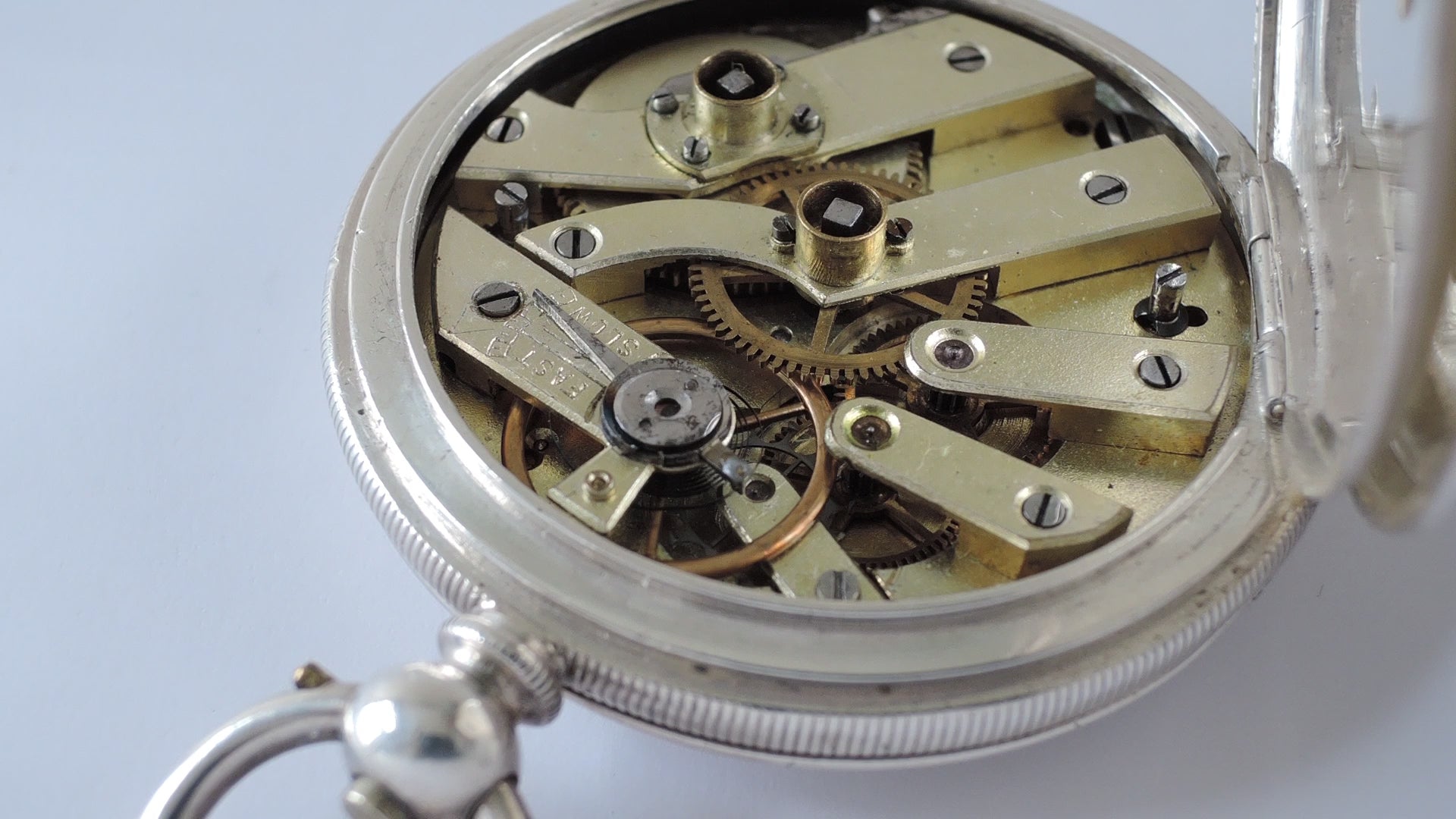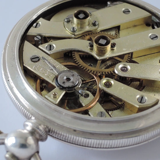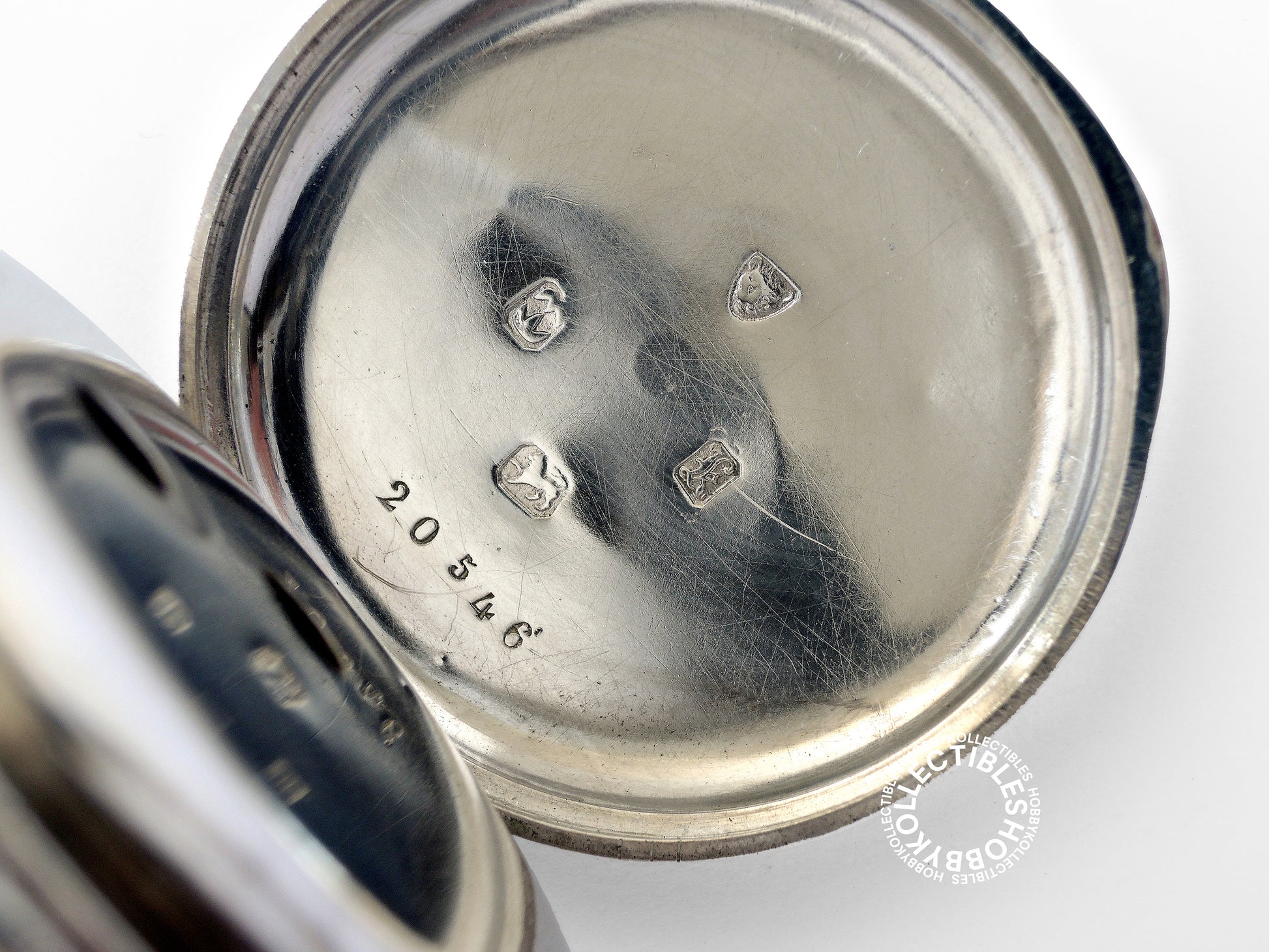 Case : Sterling silver with engine tuning, it has a hinged inner, front & back cover which all works fine, but the front cover does not closed fit just because of the glass is not original(may be too thick or the cuvette not fit) otherwise all other closure shut tightly, back & inner cover both signed "20546", stamped with full hallmarks, few dirt with normal wear and marks.
