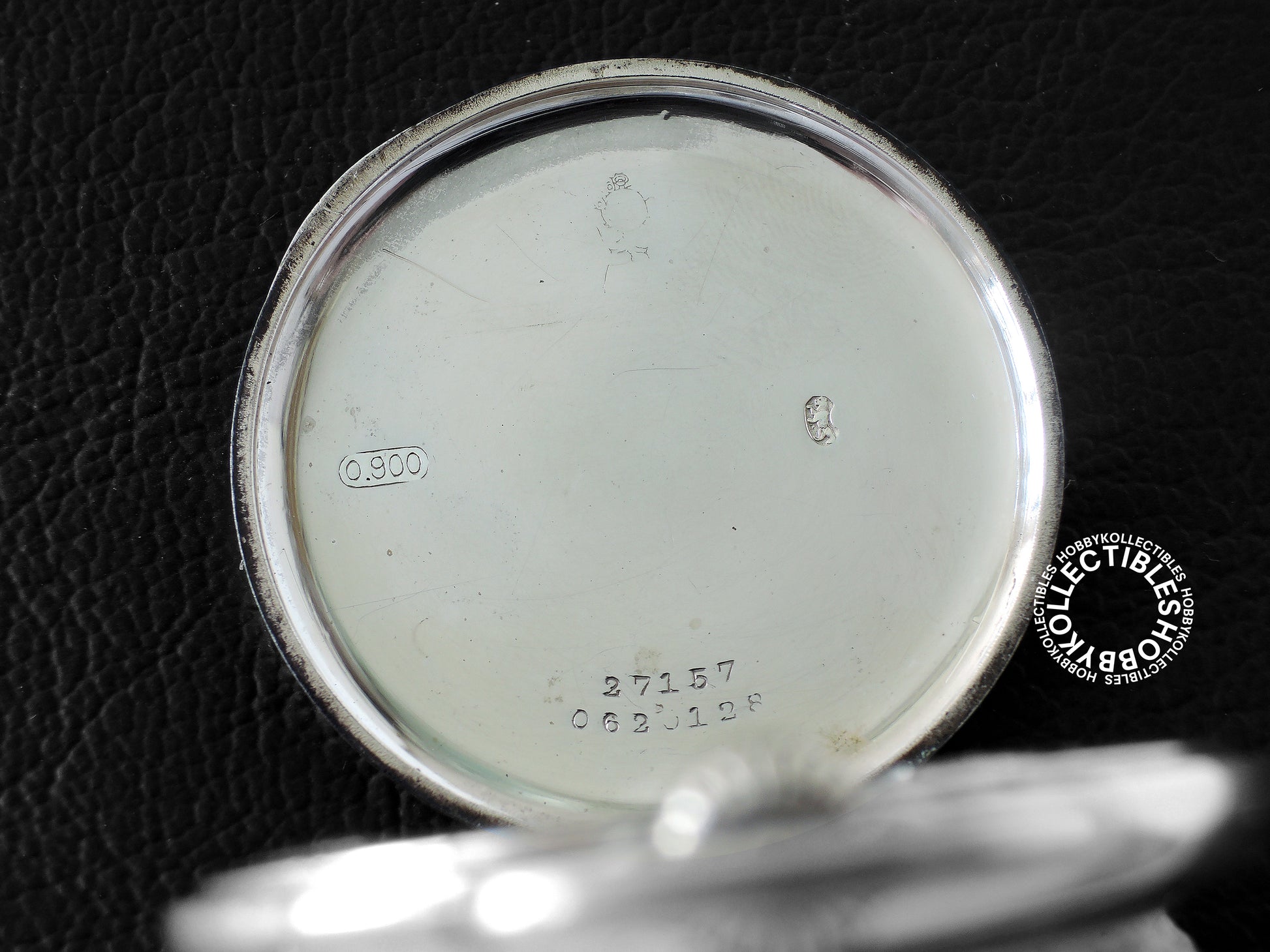 Case : 900 Silver open face with full hallmarks, it has a hinged front and back, all hinges and catches are all working fine. Inner back cover marked "0.900 27157 0626128". Dirty with stains and scratches.