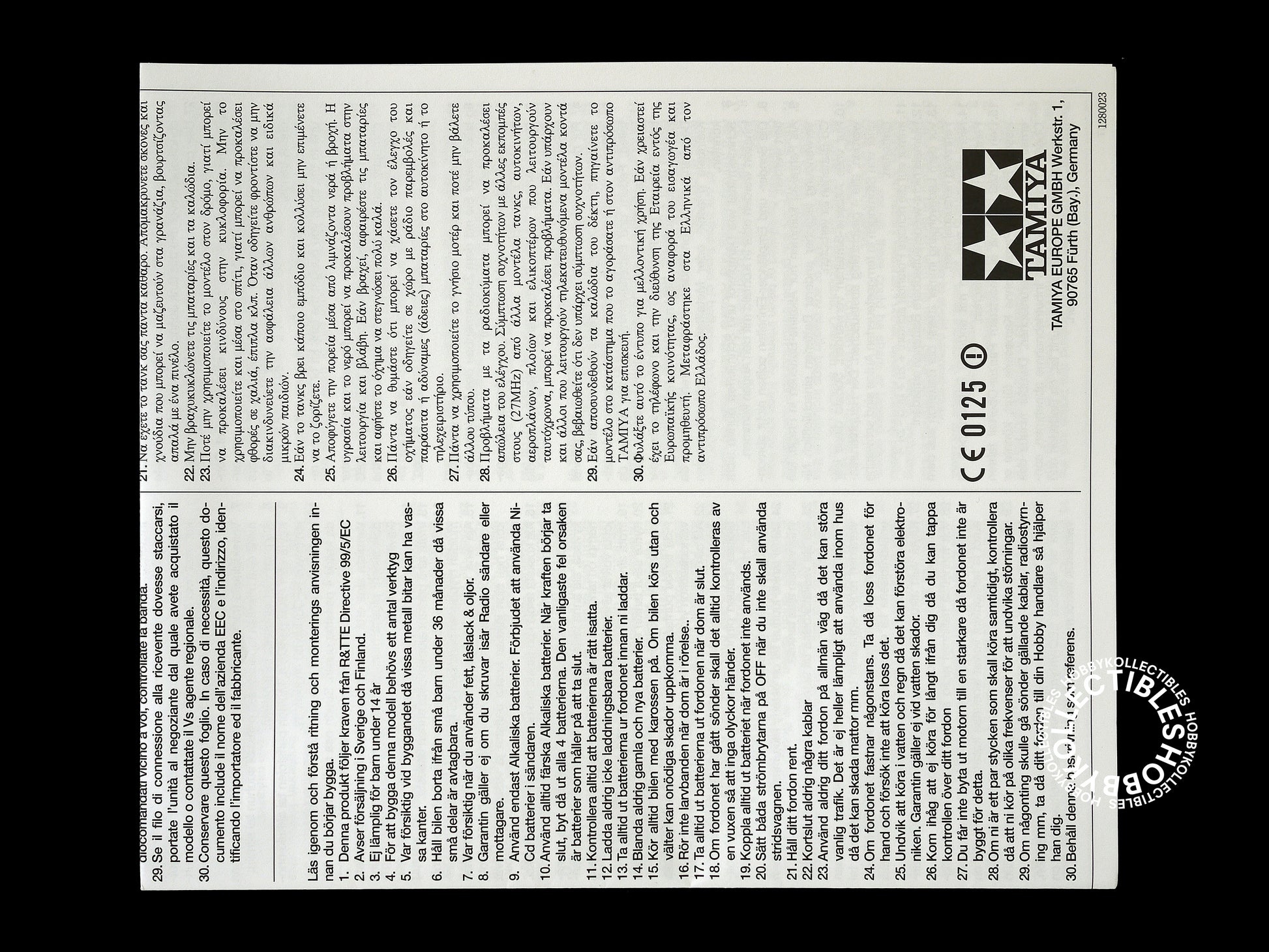 • Quadrilingual instruction sheet - slightly yellowed, few dirt with stains.