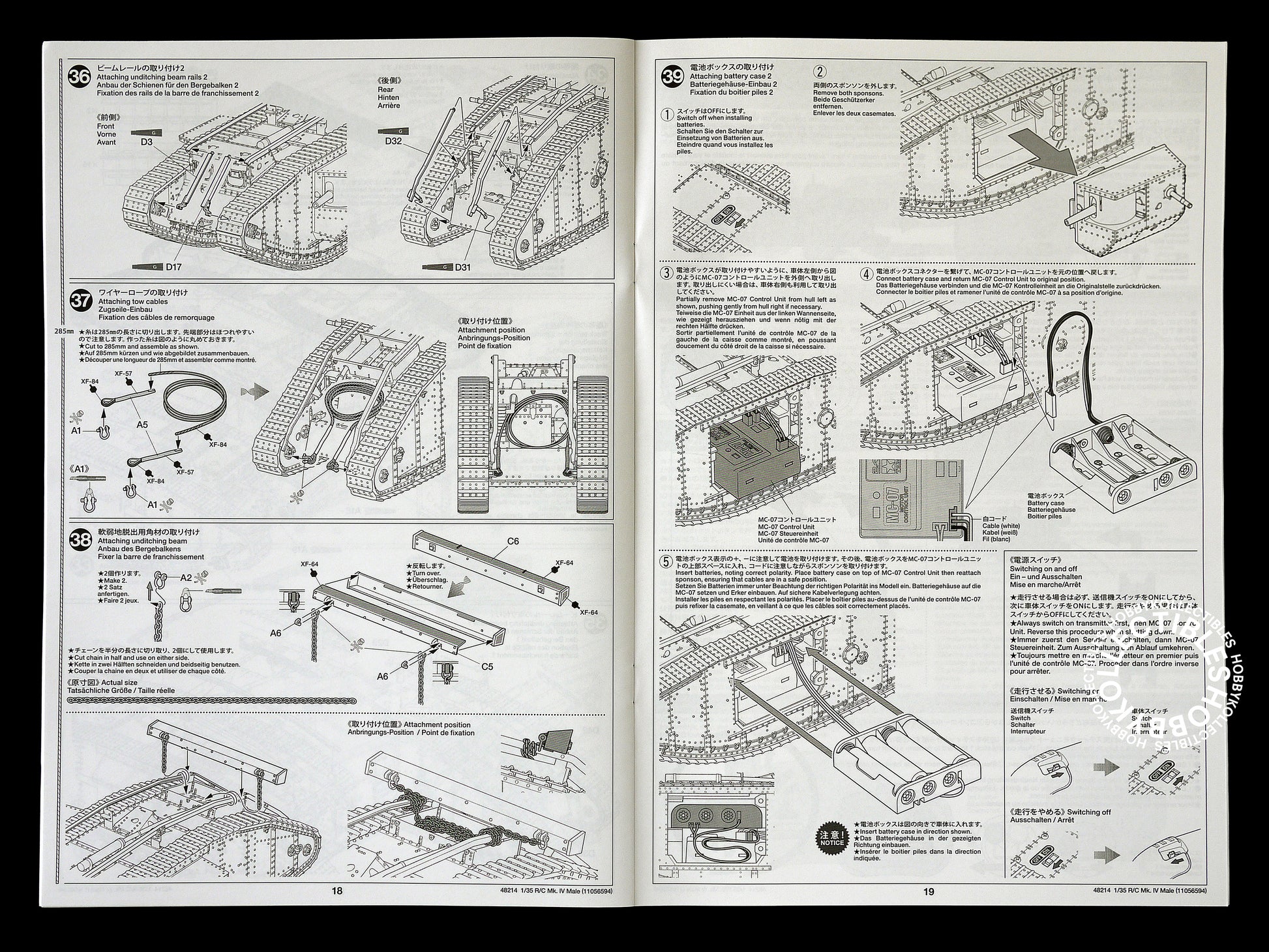 This is a 1/35 R/C model assembly kit which depicts the Mk.IV Male, expertly capturing its distinctive form with tracks wrapped around the rhomboid hull. Two pre-assembled gearboxes are installed in the hull rear, each with a motor controlled via the MC-07 control unit, allowing a range of speeds and turning circles, even pivots. Four function buttons on the transmitter can be used to define the model's top speed. Link type assembly tracks facilitate realistic motion for hours of R/C fun! Three marking options are included in the kit.