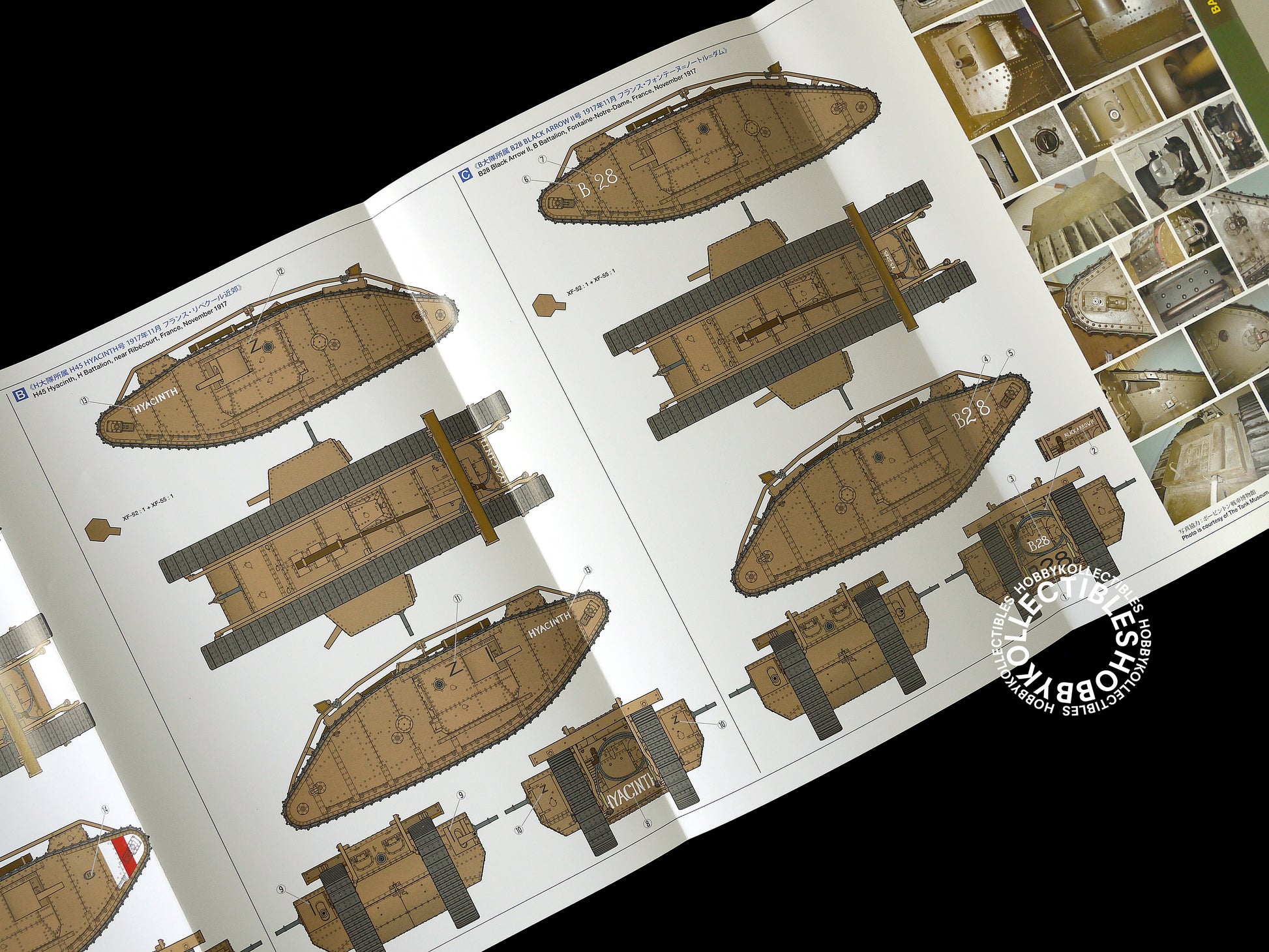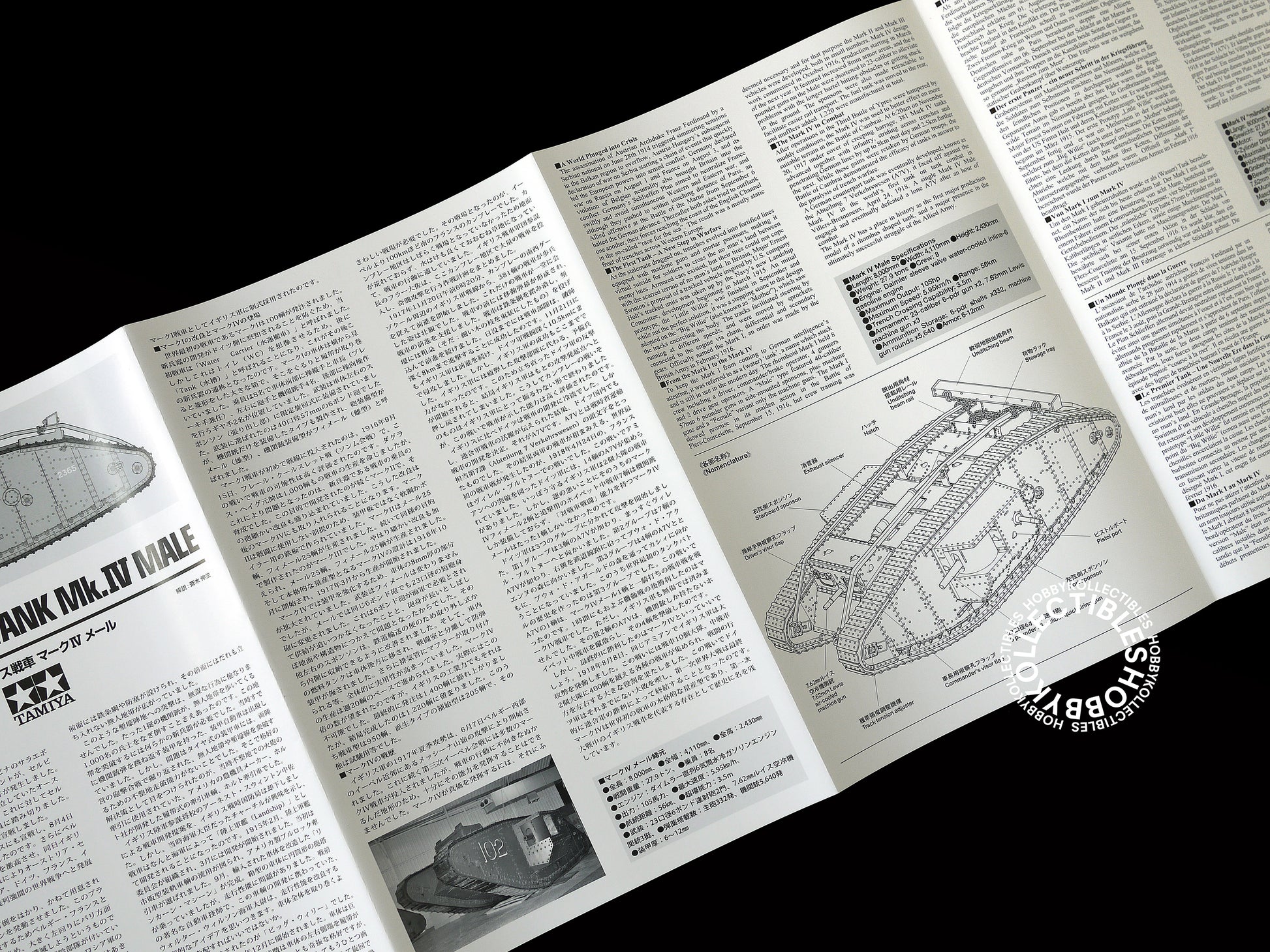 During WWI, much of Western Europe was reduced to a massive battlefield criss-crossed by a seemingly unending network of trenches. The original British Mk.I tank was developed to break the deadlock; the Mk.IV was a later model based on many of the same design principle, and of which around 1,000 were produced starting in March 1917. A "Male" variant was developed to smash through enemy lines and in addition to machine guns it utilized large 6-pounder guns, in contrast to the separate Female variant equipped with only machine guns for armament. The Mk.IV saw a variety of action, including a mass deployment of around 400 at the Battle of Cambrai in November 1917, additionally prevailing in the world's first tank on tank battle with the German A7V in April 1918.