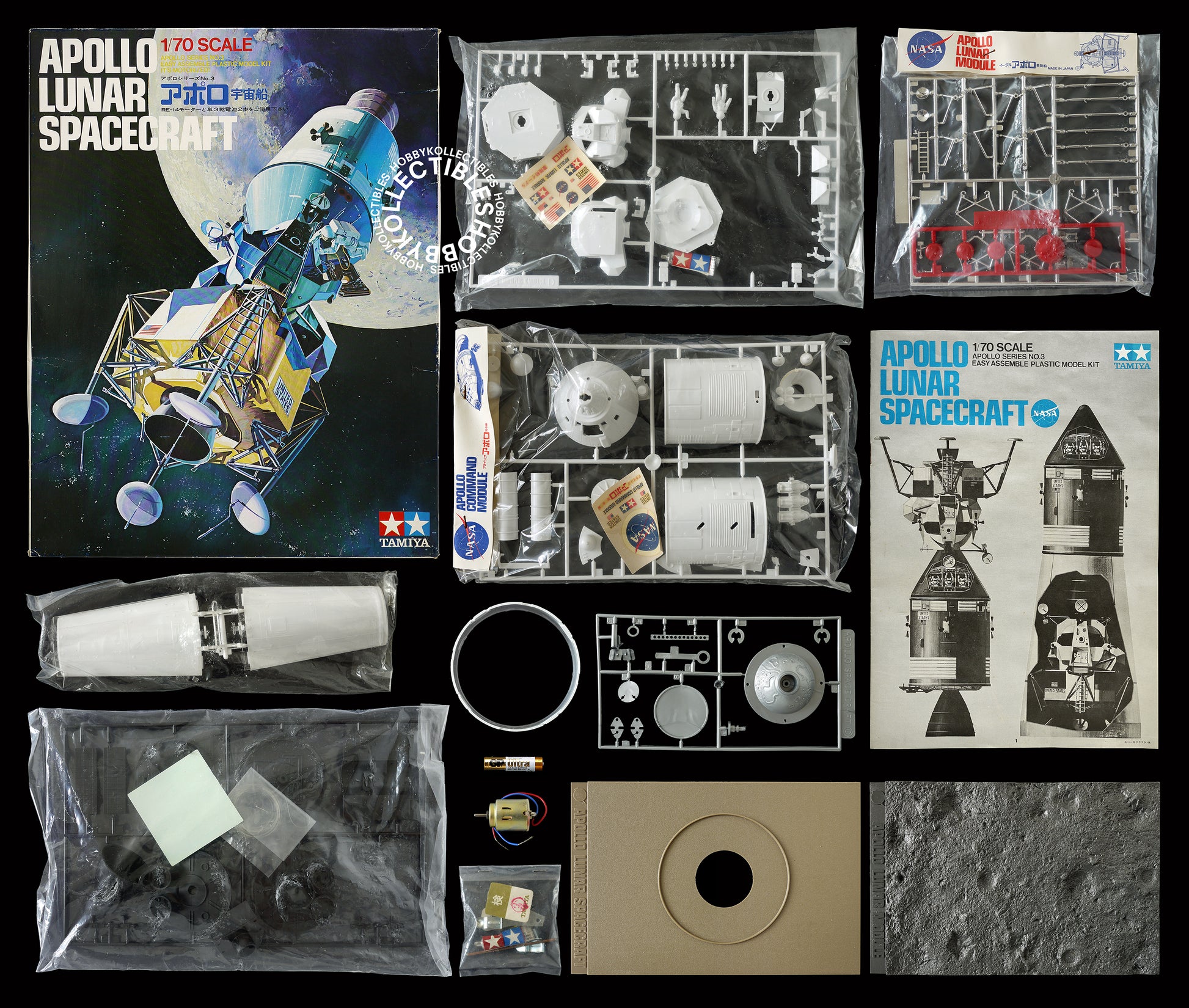Up for sale is a important, rare & beautiful 1/70 Apollo spacecraft model kit, this is the 1st motorized version released in 1969 with English instruction manual which sell in the US market, comes with both command module & service module with lots of detailed plastic injection parts, wire and a RE-14 motor included! Truly a exceptional awesome kit made by Tamiya.